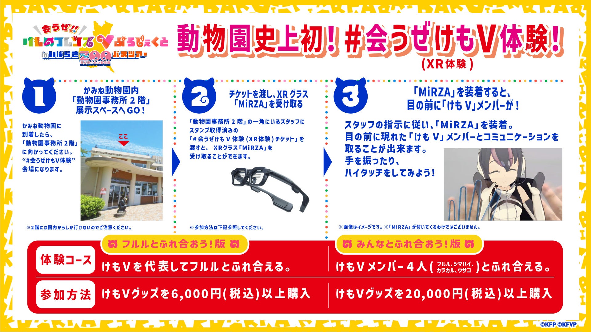 本コラボでは、株式会社NTTコノキューデバイスが開発しコノキューが販売するXRグラス「MiRZA®(ミルザ)」を装着すると、「けもV」メンバーとコミュニケーションが取れる、「XR体験」を行うことができる。XR体験に来園するメンバーはフンボルトペンギン、シマハイイロギツネ、カラカル、ウサギコウモリの4名を予定。