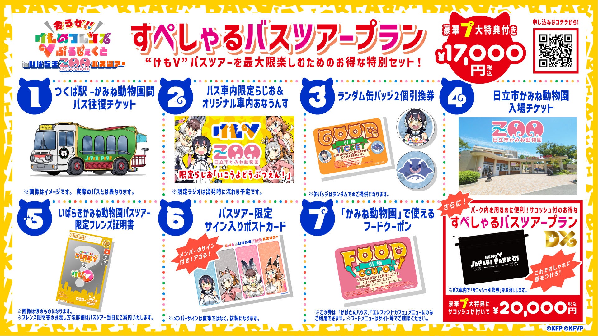 ①つくば駅-日立市かみね動物園間バス往復チケット / ②バス車内限定らじお & オリジナル車内あなうんす / ③ランダム缶バッジ2個引換券 / ④日立市かみね動物園入場チケット / ⑤バスツアー限定フレンズ証明書 / ⑥バスツアー限定サイン入りポストカード / ⑦かみね動物園で使えるフードクーポン