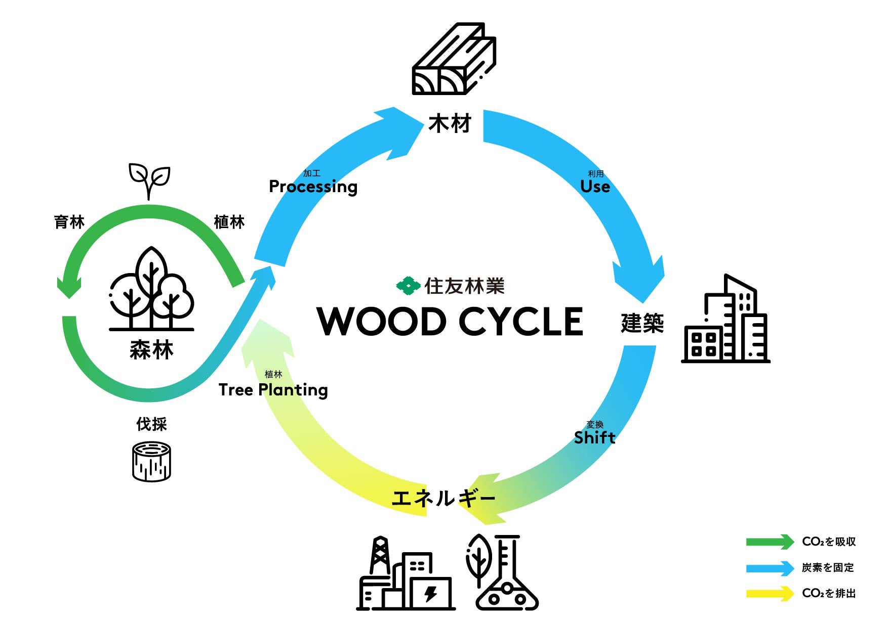 住友林業グループは森林経営から木材建材の製造・流通、戸建住宅・中大規模木造建築の請負や不動産開発、木質バイオマス発電まで「木」を軸とした事業をグローバルに展開しています。2030年までの長期ビジョン「Mission TREEING 2030」では住友林業のバリューチェーン「ウッドサイクル」を回すことで、森林のCO2吸収量を増やし、木造建築の普及で炭素を長期にわたり固定し、自社のみならず社会全体の脱炭素に貢献することを目指しています。今後も建築での木材・木材由来素材の利用と他材料から木への代替を促進し、脱炭素化を加速させます。