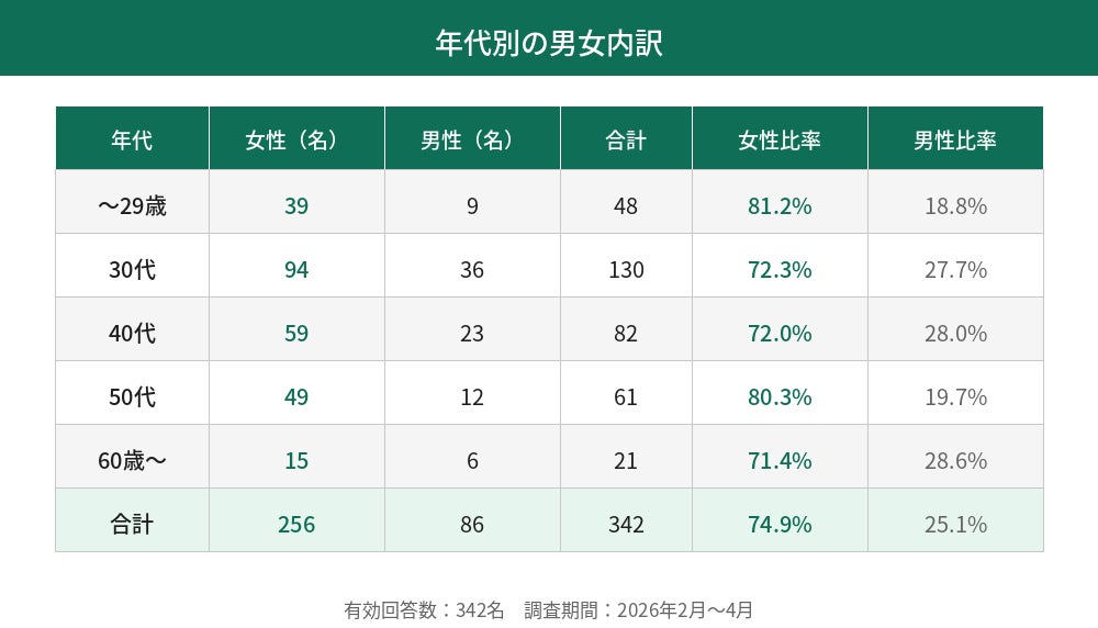 回答者342名のうち、女性は256名(74.9%)と全体の約4分の3を占め、男性(86名・25.1%)を大きく上回りました。