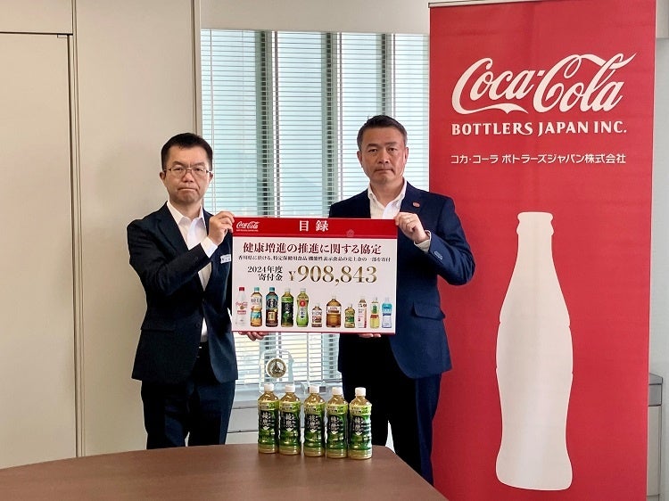 コカ・コーラ ボトラーズジャパン株式会社(本社:東京都港区 代表取締役社長 最高経営責任者:カリン・ドラガン 以下当社)は、香川県との「健康増進の推進に関する協定」に基づき、当社が香川県内で販売する特定保健用食品および機能性表示食品の売り上げの一部である908,843円を寄付し、寄付にあたり、2025年5月20日に香川県健康福祉部長 長尾 英司様を訪問し、寄付金目録を贈呈しました。