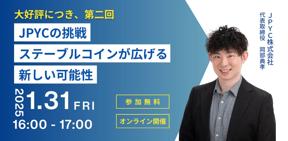 JPYC株式会社(本社:東京都千代田区、代表取締役:岡部 典孝)は、2025年1月31日(金)16:00より日本円ステーブルコイン「JPYC Prepaid」に関するセミナーを開催いたします。本セミナーでは、初心者の方にも分かりやすく、JPYCの基本から最新の活用事例までを解説いたします。デジタル通貨の仕組みを学びたい方にとって、最初の一歩を踏み出す絶好の機会となっておりますのでぜひご参加下さい。