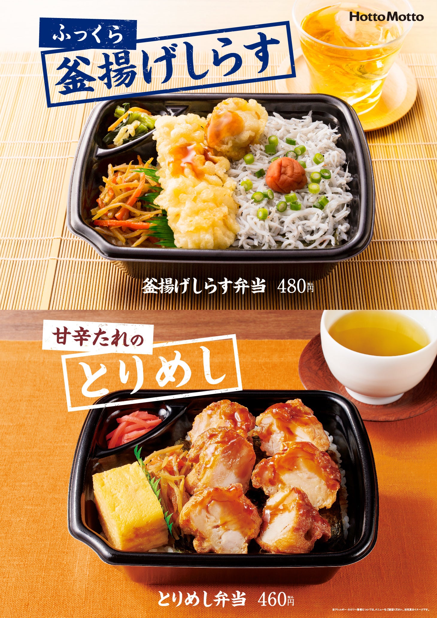 株式会社プレナスは、持ち帰り弁当の「Hotto Motto (ほっともっと)」を、2022年3月末現在、2,487店舗展開しております。このたび「ほっともっと」では、ふっくらとした国産しらすとイカ・ホタテの天ぷらを盛り付けた『釜揚げしらす弁当』480円を、5月10日(火)より発売いたします。また同日より、2022年4月1日(金)より岡山県22店舗限定で販売し、ご好評いただいている『とりめし弁当』460円が、全国の店舗で登場いたします。