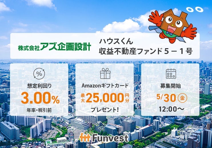 「未来をわかちあう投資」を提供する「Funvest(ファンベスト)」(以下、Funvest)は、「アズ企画設計 ハウスくん収益不動産ファンド5-1号」(以下、本ファンド)の募集を5/30より開始しますので、お知らせいたします。