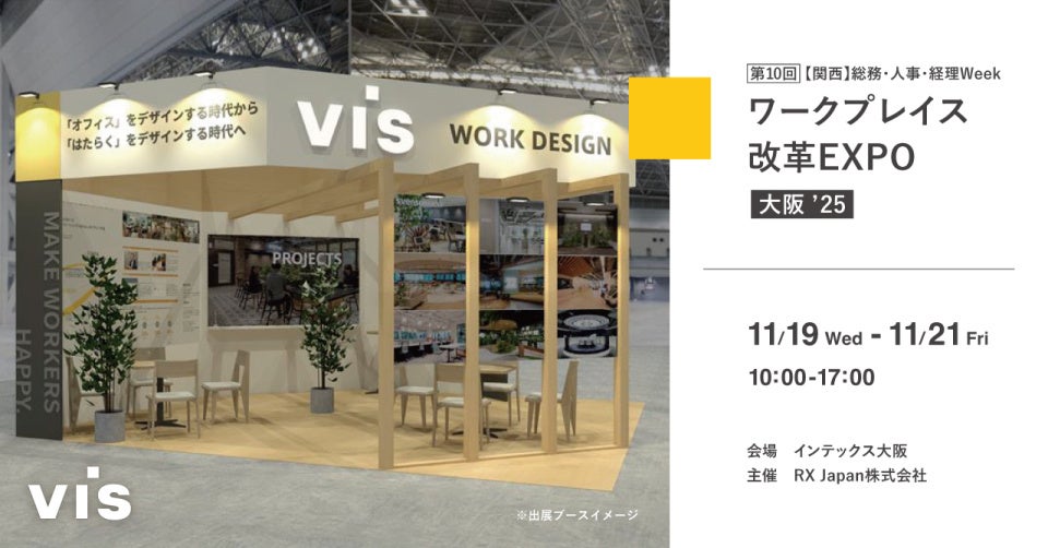 『ワークデザイン』を手がける株式会社ヴィス(本社:東京都港区、代表取締役社長:金谷智浩)は、2025年11月19日~21日にインテックス大阪で開催される「ワークプレイス改革EXPO」に出展いたします。