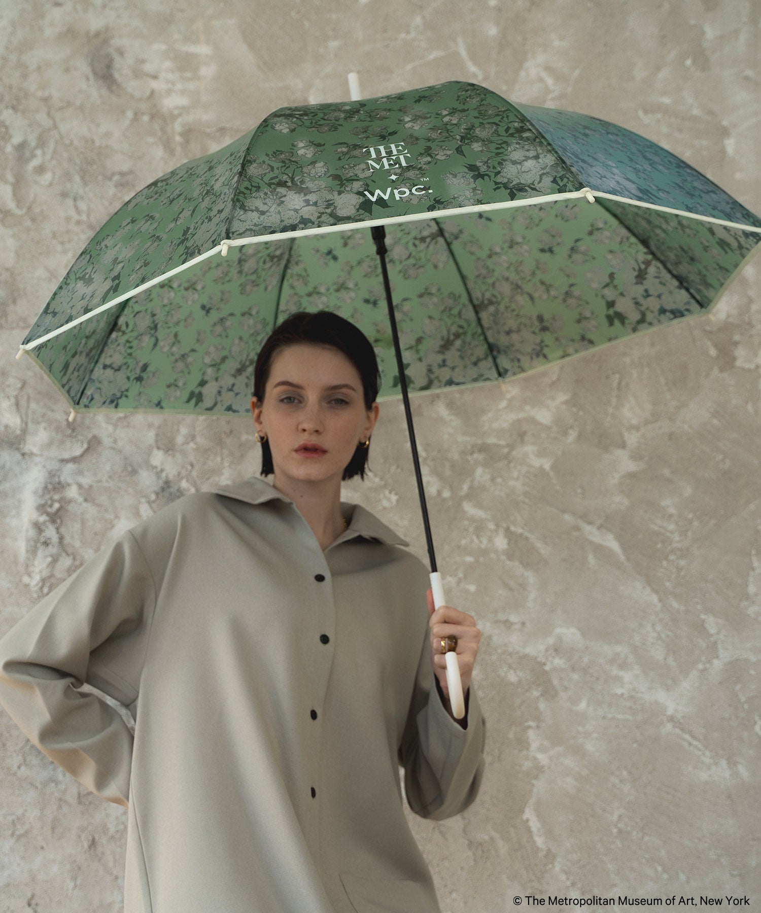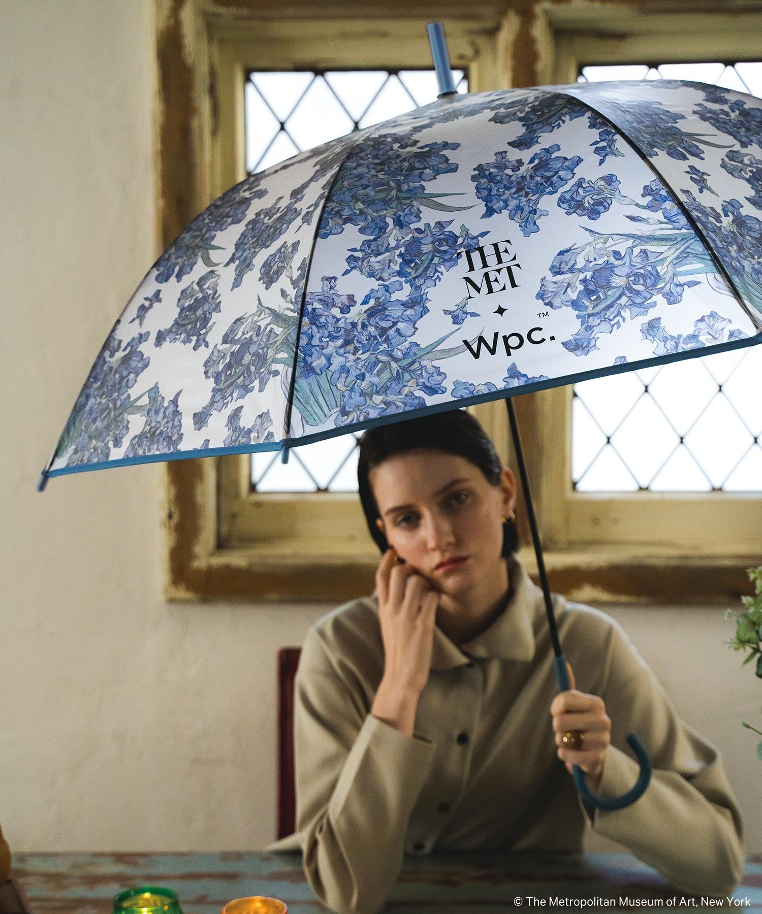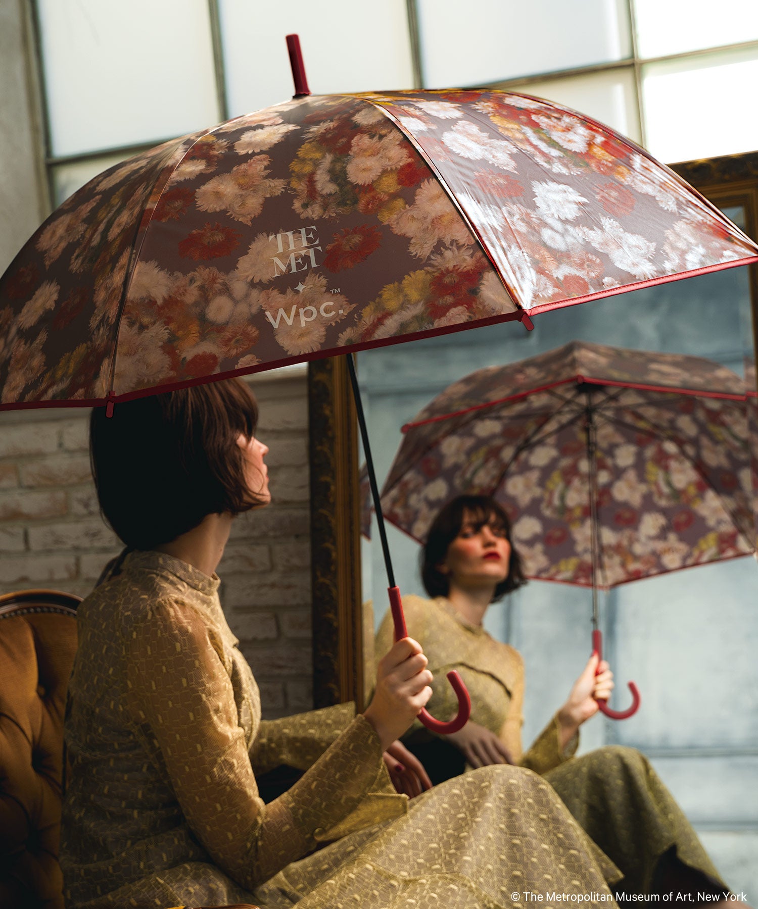 傘全体を大胆に使った花柄プリントは秋雨に合うしっとりした雰囲気に仕上げ、傘のデザインとリンクしたパイピングや持ち手の色味、”THE MET”とWpc.のワンポイントロゴも特徴になっています。また長傘と折りたたみ傘での展開となっており、折りたたみ傘はきれいにたたまなくても収納できる、実用的なクラッチ型。ケースを大きく使って名画をプリントし、高級感を演出しています。