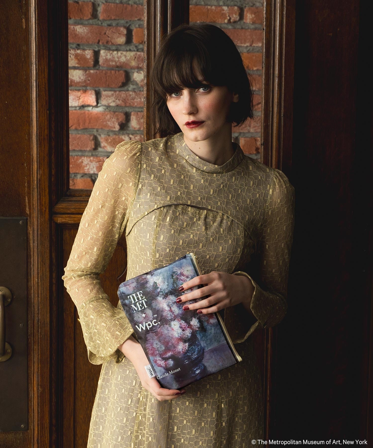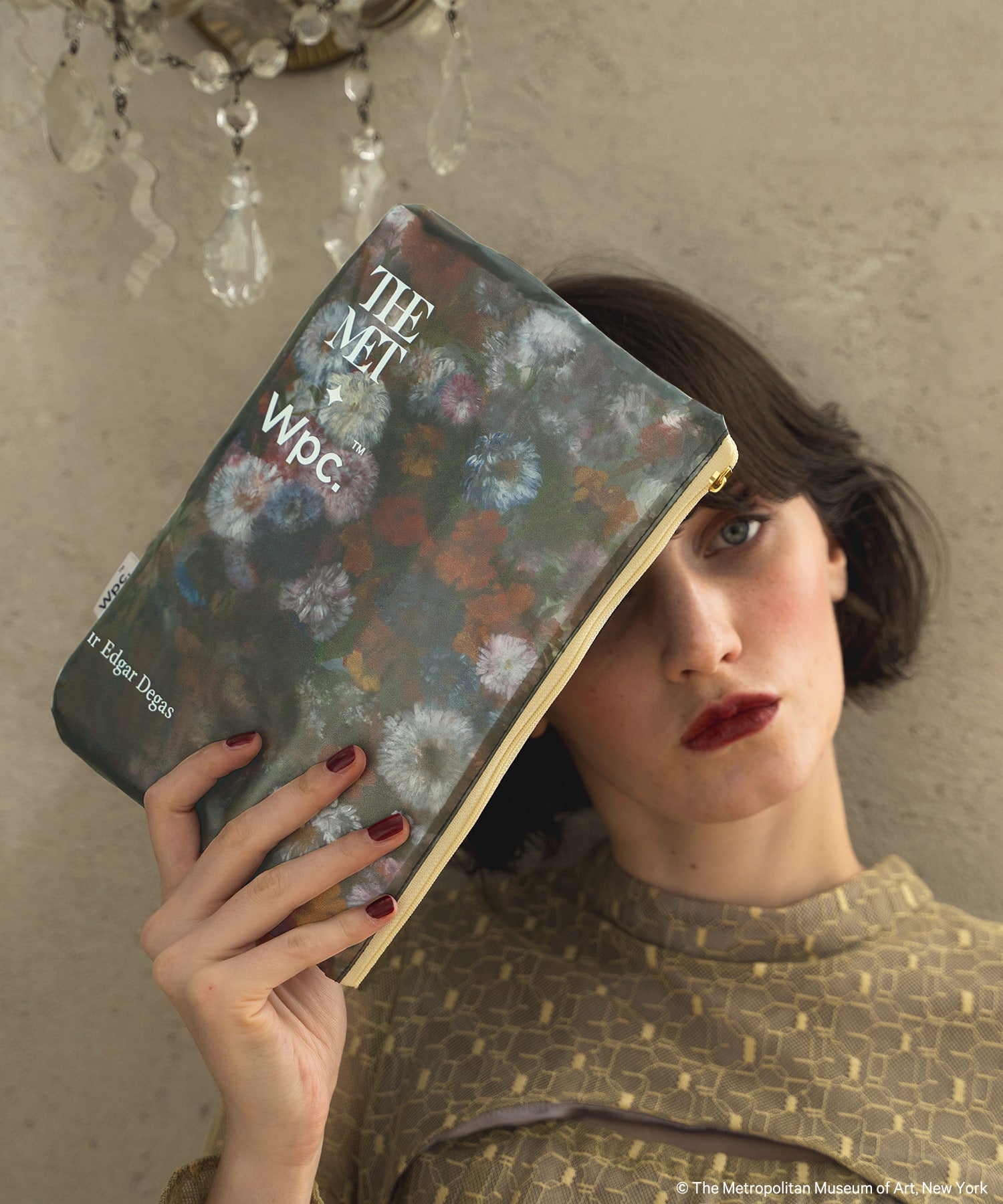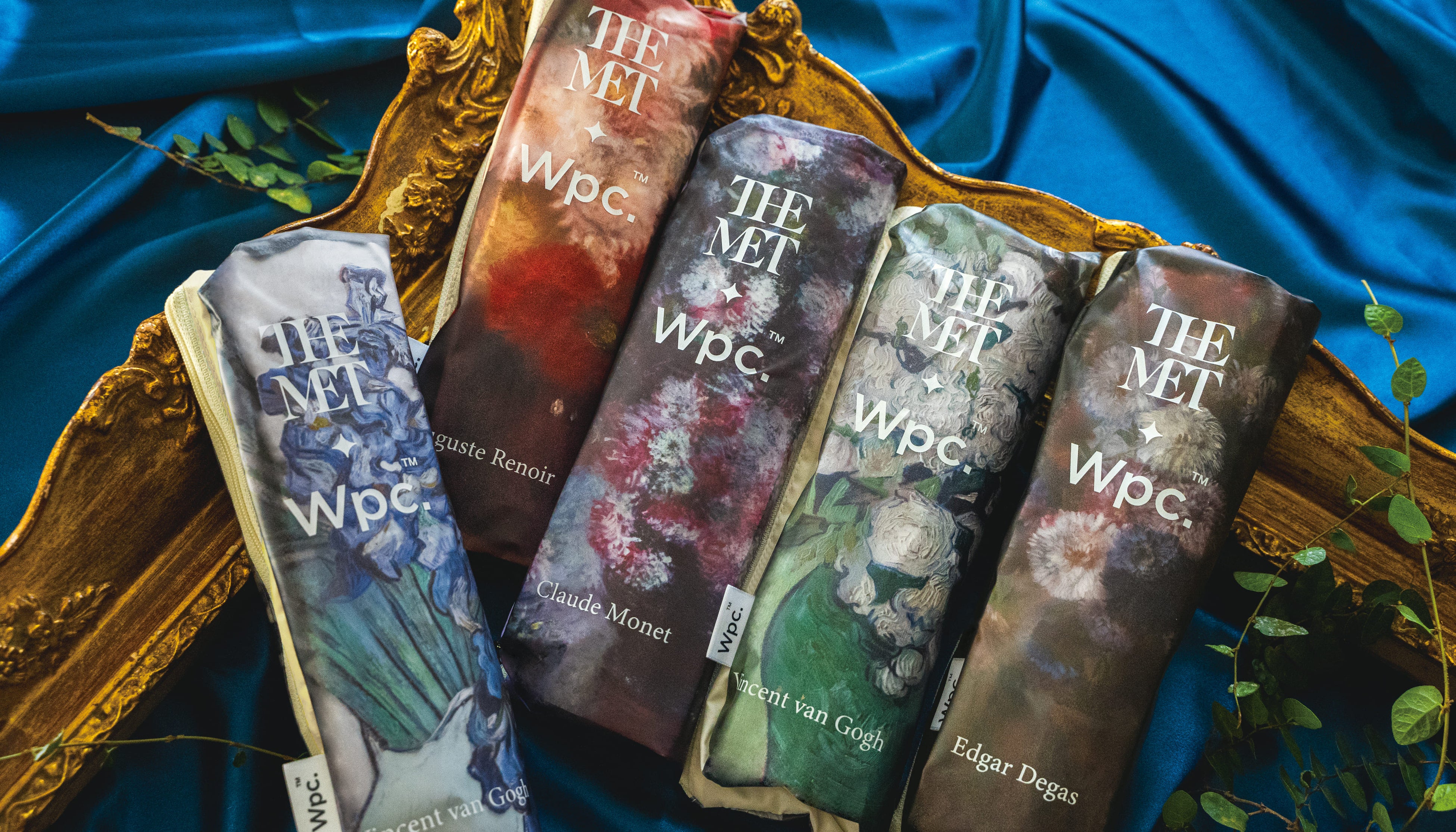 傘全体を大胆に使った花柄プリントは秋雨に合うしっとりした雰囲気に仕上げ、傘のデザインとリンクしたパイピングや持ち手の色味、”THE MET”とWpc.のワンポイントロゴも特徴になっています。また長傘と折りたたみ傘での展開となっており、折りたたみ傘はきれいにたたまなくても収納できる、実用的なクラッチ型。ケースを大きく使って名画をプリントし、高級感を演出しています。
