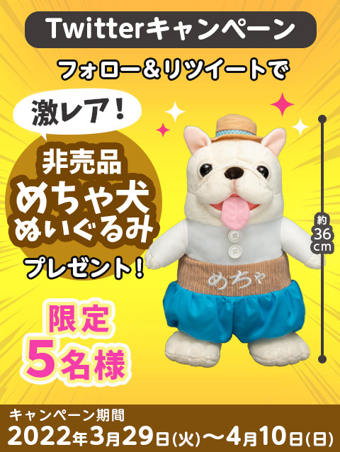 - 抽選で5名さまに非売品めちゃ犬ぬいぐるみが当たるTwitterキャンペーンを開催