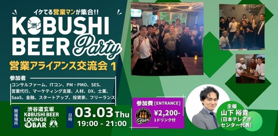 KOBUSHI MARKETING合同会社(東京都渋谷区、代表:井上裕介)が運営する渋谷道玄坂の『KOBUSHI BEER LOUNGE & BAR』では、人と人とを繋ぐユニークな取り組みを行い多くのビジネスチャンスを生み出している。そして今回、2026年3月3日(火)19:00~日本テレアポセンター 山下代表が幹事を務め、イケてる営業マン同士でアライアンスを組むための交流会を開催すると発表した。