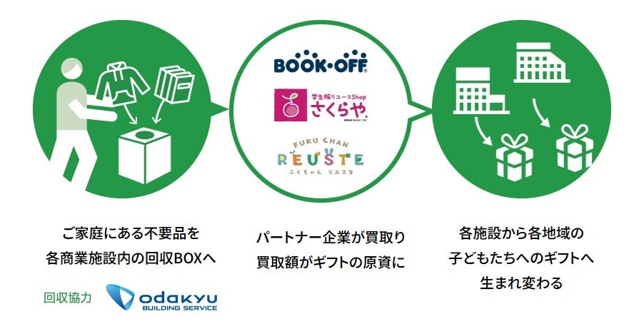 お客さまがご家庭で不要になった衣類や本などを、小田急沿線の8つの商業施設に設置した回収ボックスにて回収(不要品回収サポート:株式会社小田急ビルサービス)、集まった不要品を協力会社(ブックオフコーポレーション株式会社・学生服リユースShopさくらや・株式会社REGATE[ふくちゃんリユスタ])の3社で査定。その査定額を元に「子育て応援」や「地域課題の解決」をテーマとしたギフトを、各施設が立地する自治体に寄贈します。ぜひこの機会に ご家庭の不要品を各施設へお持ちください。
