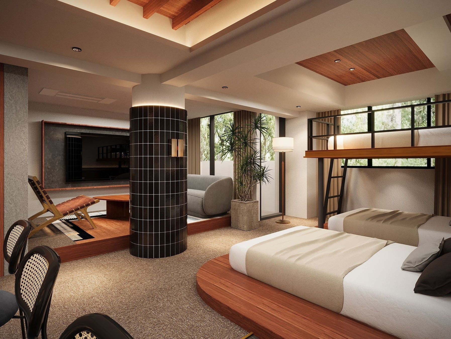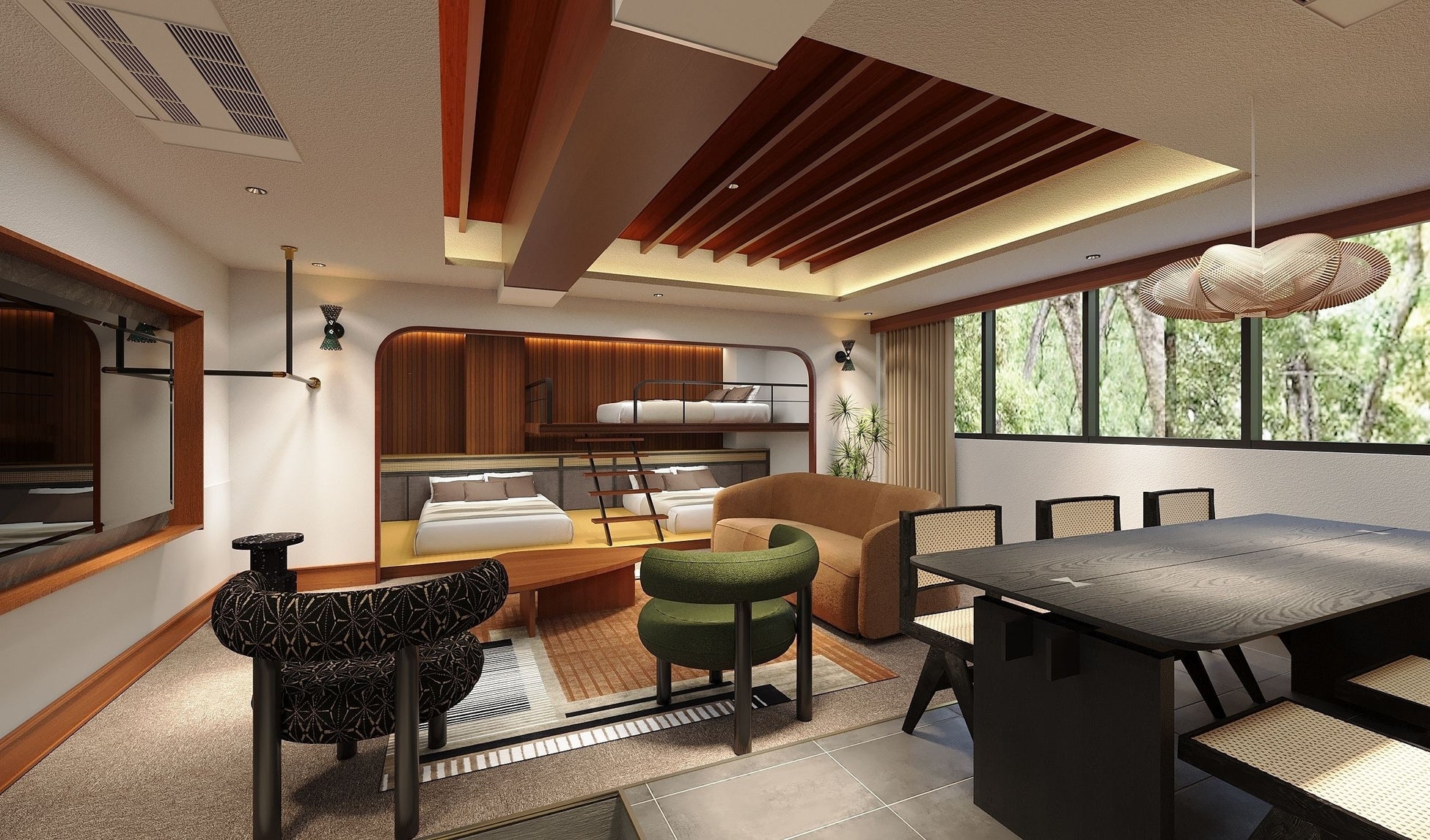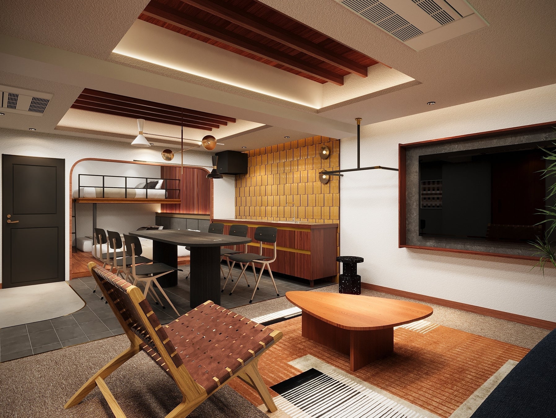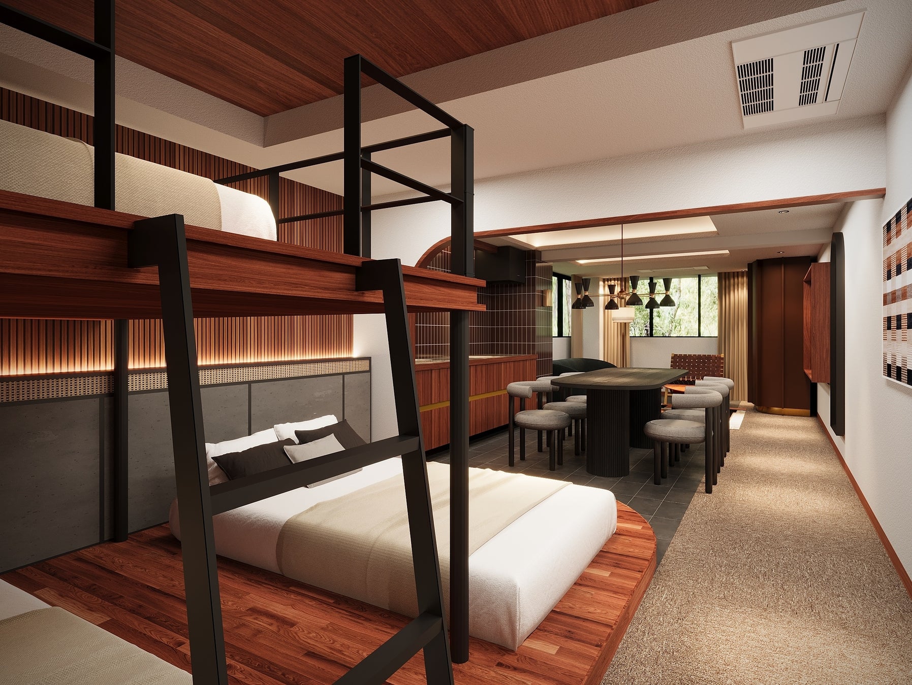 ミッドセンチュリー調のデザインに京都の美意識を取り入れた空間に、上質な家具を配し、趣のあるしつらえに仕上げました。全室にダブルベッド3台を備え、ミニキッチンや洗濯乾燥機、電子レンジなどの充実した設備を完備し、長期のグループ滞在でも快適にお過ごしいただける客室となっています。