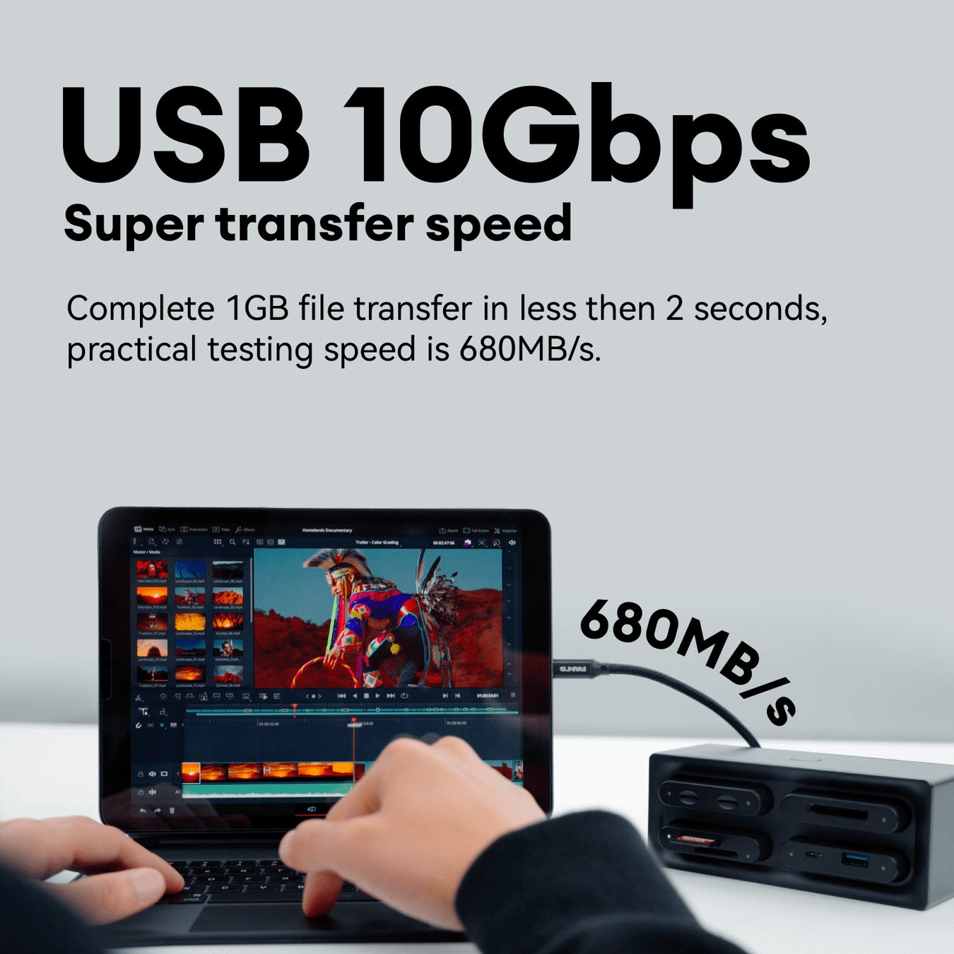 今回の製品は映像系クリエイターチームーYoutuber Mediastormよる設計したCard Reader Hubです。(Mediastorm:中国bilibiliで491万視聴者登録があります。)アルミニウム合金ボディ、強くて丈夫な製品です。USB 10Gbps高速伝送、最大680mb/sに達し、便利で実用的な伝達ツールです。