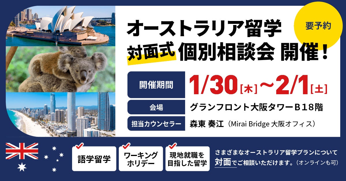留学支援サービス「Mirai Bridge」、オーストラリア留学の無料個別相談会を大阪で開催