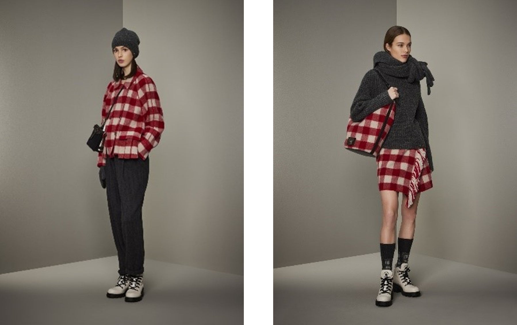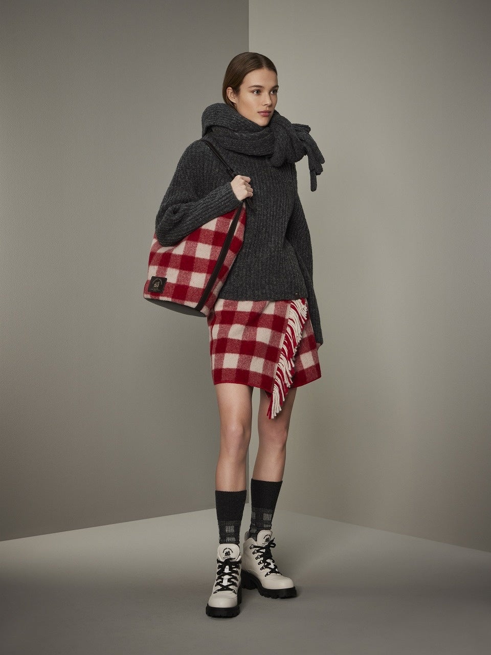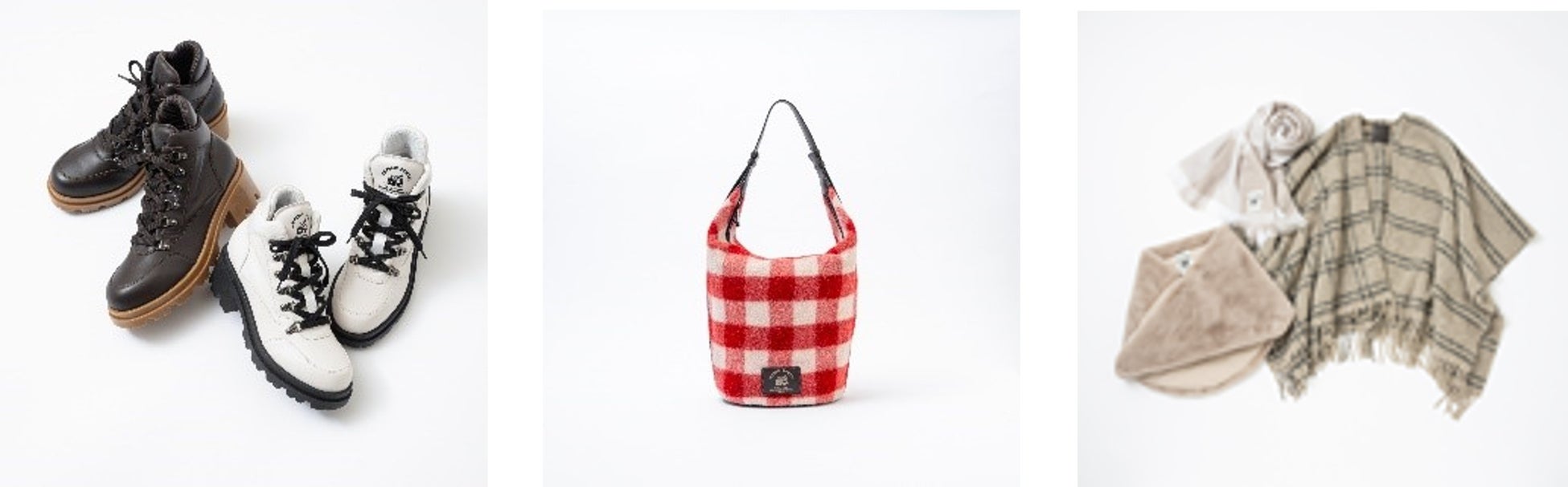 また、小物類も豊富に登場します。コレクションテーマを強く感じさせるマウンテンブーツ、赤のブロックチェック柄のショルダーバッグ、さらりと羽織れるストールなど、いずれのアイテムも洋服と統一された世界観を楽しむことができます。