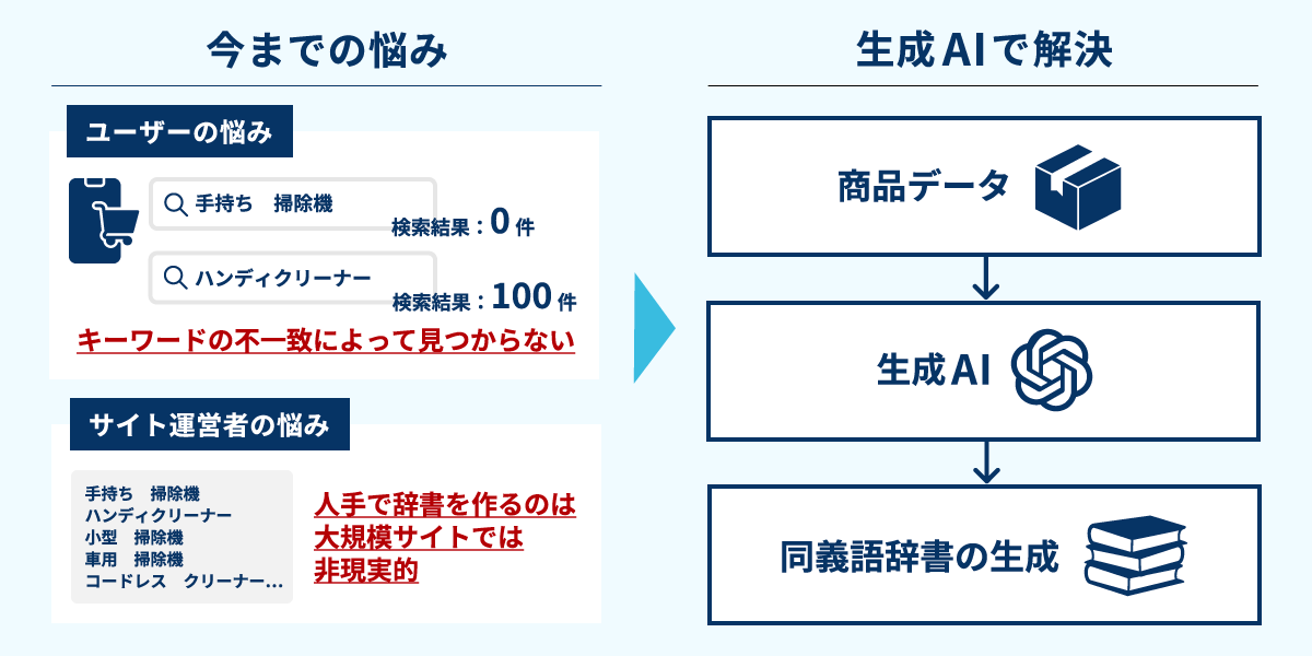 この問題に対処するため、「同義語辞書」の設定が効果的です。しかし、人手で同義語辞書を維持管理・更新するには、ユーザーの検索行動を常に追跡する必要があり、多大な人的コストがかかります。