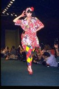1980年代、パリでは身体のラインを強調したボディコンシャスなデザインが大流行した一方で、川久保玲や山本耀司など次世代の日本人デザイナーがパリコレに参入し、「黒の衝撃」と呼ばれる革新的なコレクションが次々と発表されました。しかし、髙田賢三はその流れからは距離を置き、自らの表現を熟成させることに専念しました。本作はその好例と言えるでしょう。柄と柄、色と色が激しくぶつかり合う、エネルギッシュな組み合わせで、髙田賢三らしい作品です。
