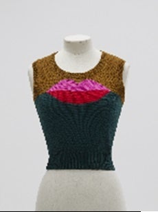 KENZO といえばニットといわれるほど、髙田賢三のニットは人気がありました。カラフルな色づかいや大胆な柄、様々なテクニックを駆使した編地で、毎回異なるイメージのニットを発表しました。唇があしらわれたニットは1970-1971AW の「ロンドン・ポップ」と名付けられたシリーズのもので、最初期の作品です。