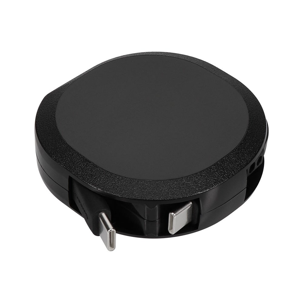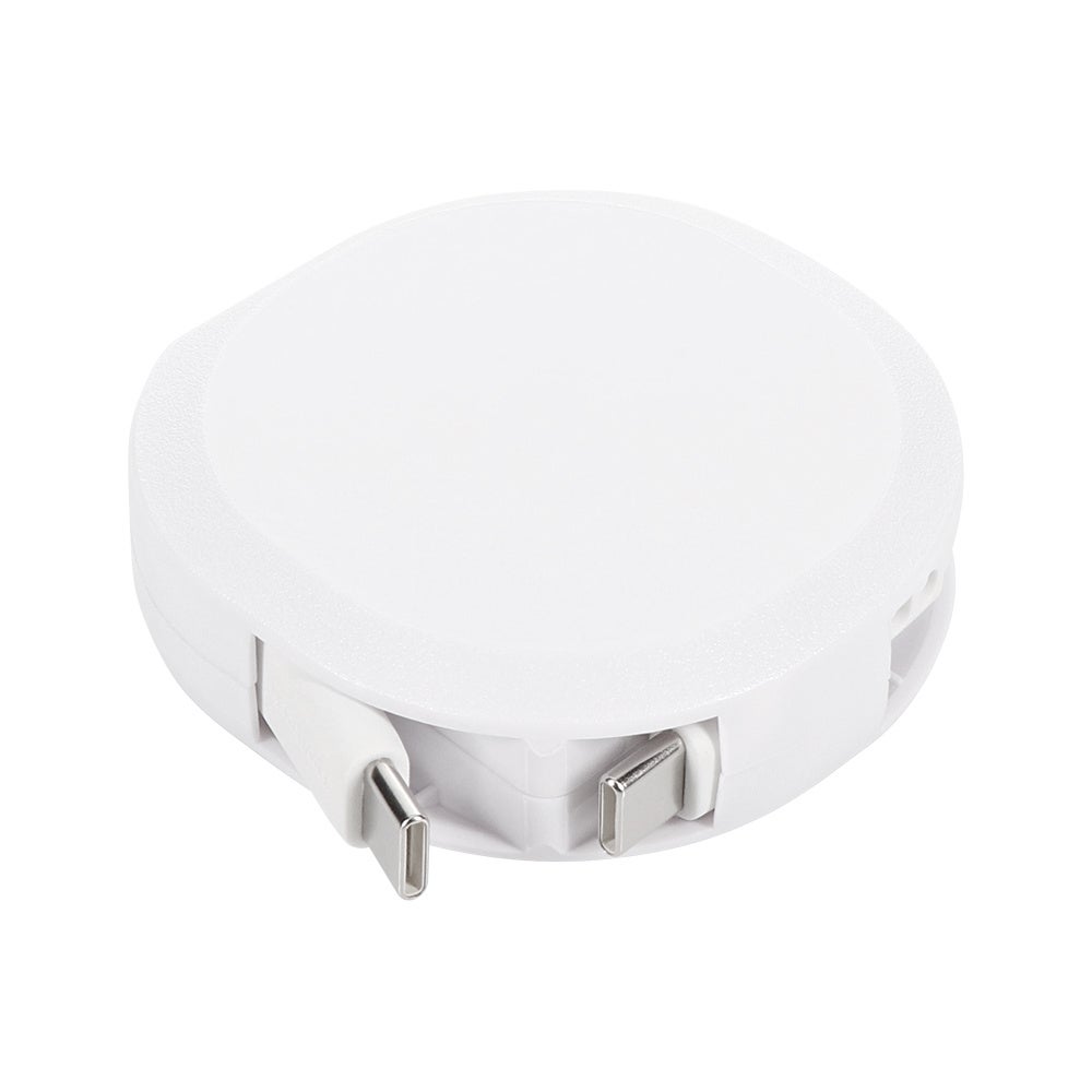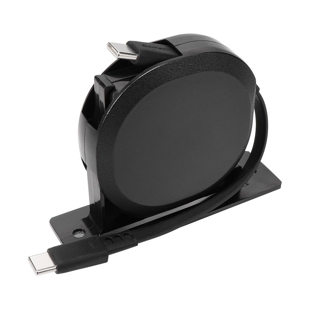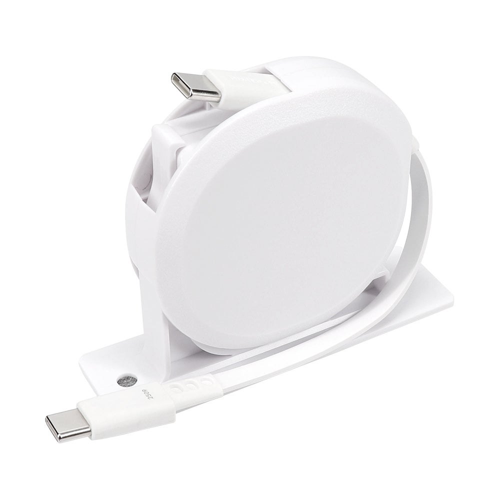 片方のケーブルだけが伸縮するからリール部分が邪魔にならず、デスク周りや外出先など多くのシーンで活躍します。手のひらに収まるサイズにケーブルを収納できるので持ち運びにも最適。