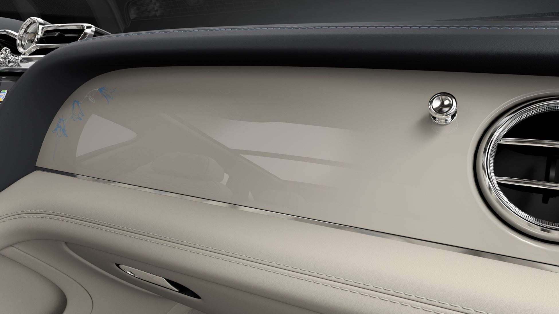 さらに、「Something Blue」のテーマを象徴するライトブルーのアクセントを随所に配しています。シートおよびヘッドレストのパイピングとステッチ、ベントレーウィングの刺繍、ディープパイルのオーバーマットの縁取りに至るまで繊細なブルーをあしらい、クリーンな基調色の中に凛とした華やぎを添えています。助手席側のIPフェイシアには、ブルーベル(日本名:ツリガネズイセン)をモチーフにしたクローム&ブルーのビスポーク・オーバーレイをレイアウト。花言葉である「変わらぬ愛」に想いを重ねた花のシルエットが静かに浮かび上がり、インテリア全体の世界観を象徴的に彩るとともに、特別なコレクションであることをさりげなく物語ります。