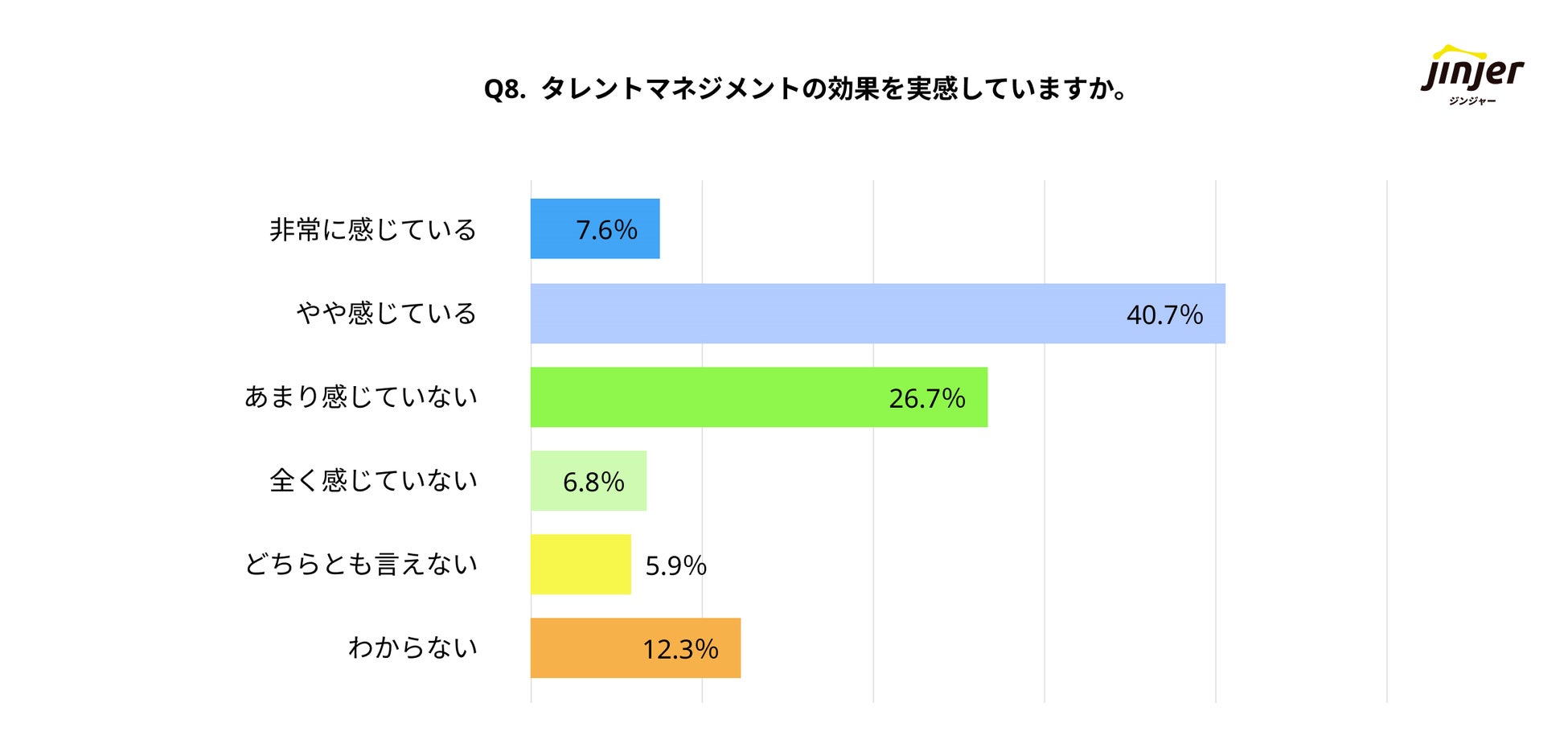 また、タレントマネジメントの効果を実感している企業は、「非常に感じている(7.6%)」、「やや感じている(40.7%)」の合わせて48.3%でした。一方で、タレントマネジメントの効果を実感できていない企業は、「あまり感じていない(26.7%)」、「全く感じていない(6.8%)」で33.5%存在することがわかりました。