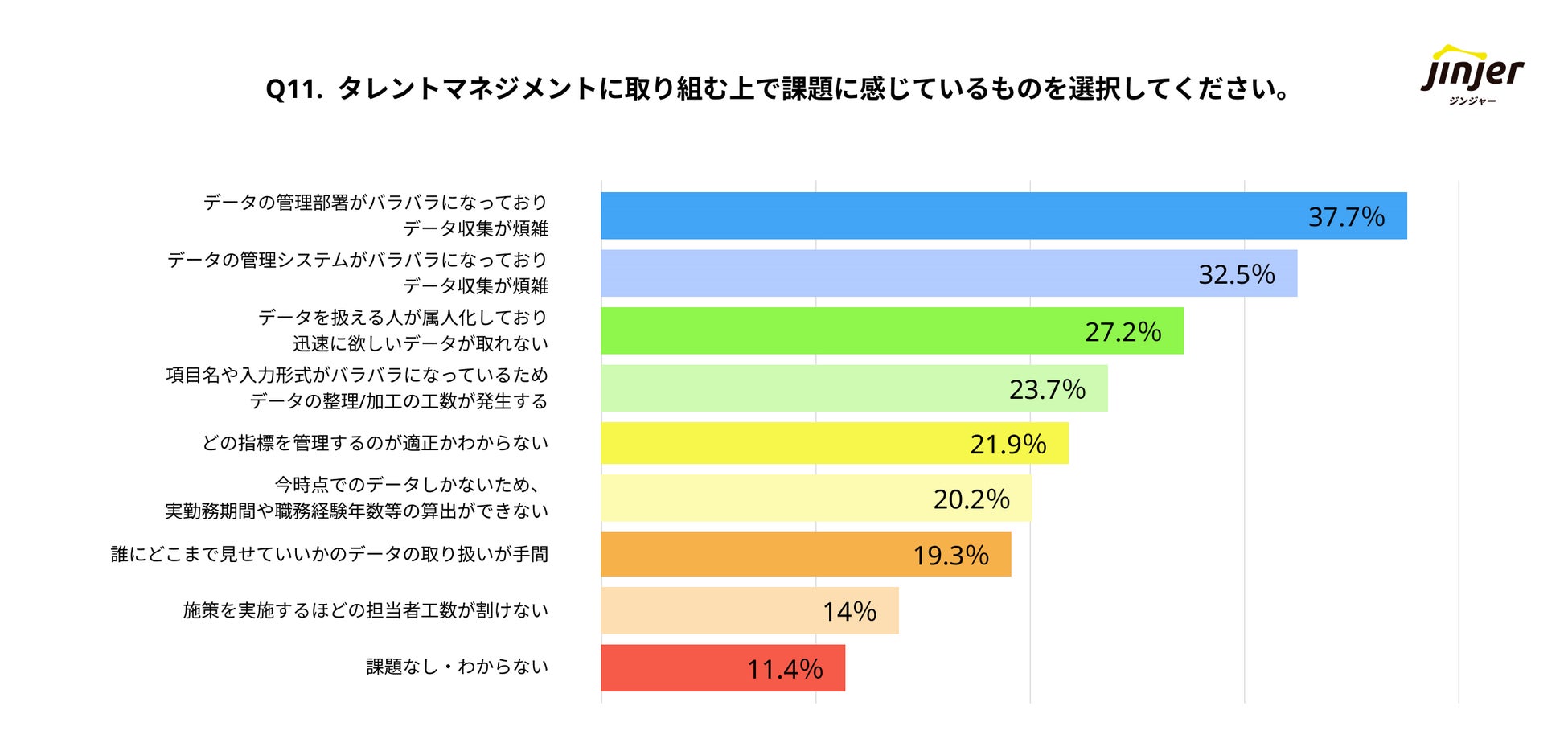タレントマネジメントに取り組む上で感じている課題(複数回答)を質問したところ、最多意見は「データの管理部署がバラバラでデータ収集が煩雑(37.7%)」でした。次いで、「データの管理システムがバラバラでデータ収集が煩雑(32.5%)」、「データを扱える人材が属人化し迅速にデータが取れない(27.2%)」、「項目名/入力形式がバラバラでデータの整理・加工の工数が発生(23.7%)」と、人事データの可視化・管理に関する意見が多く集まりました。