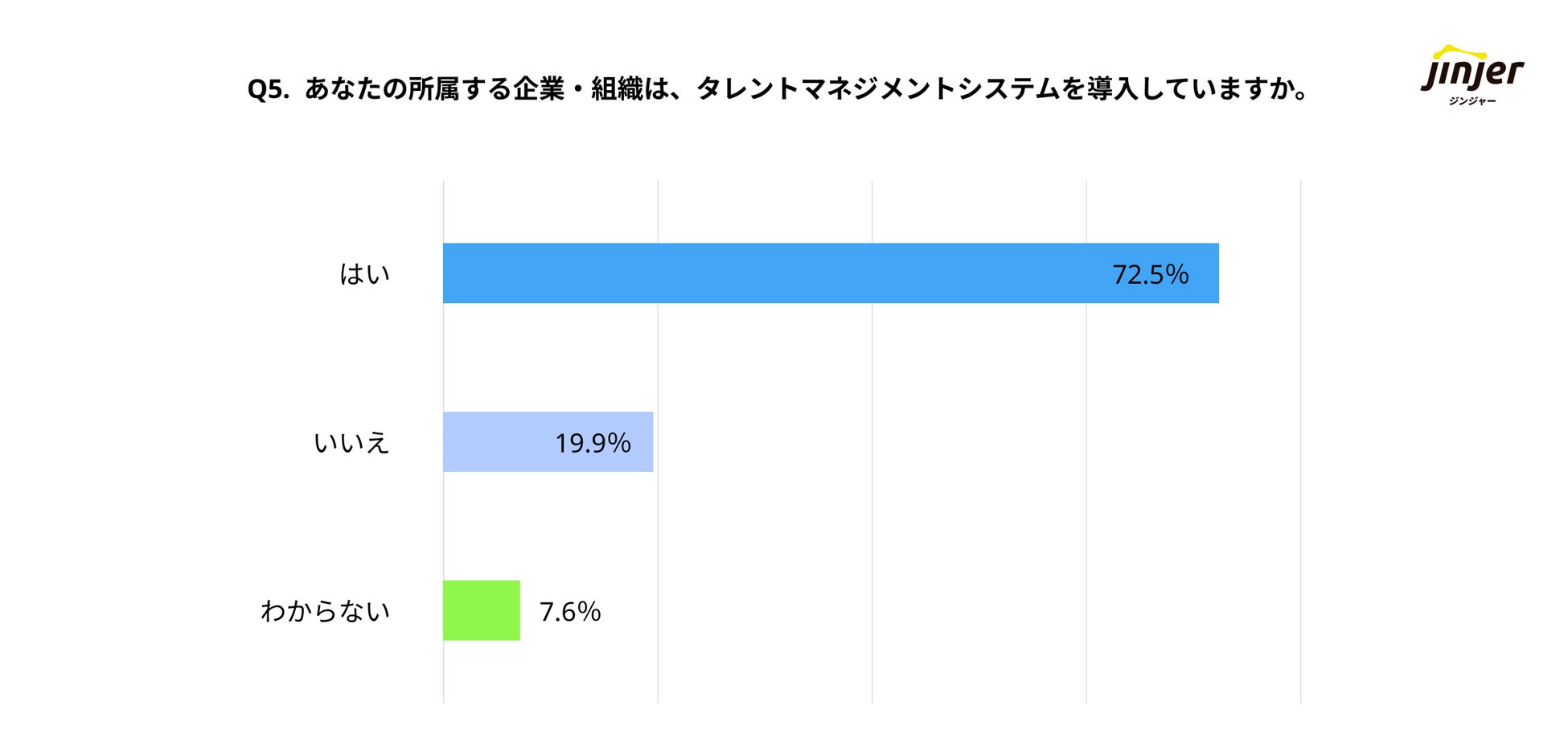 タレントマネジメントに取り組む企業へ、「タレントマネジメントシステムを導入しているか」という質問したところ、72.5%の企業が導入しており、システムを導入していない企業は20%を下回る結果となりました。