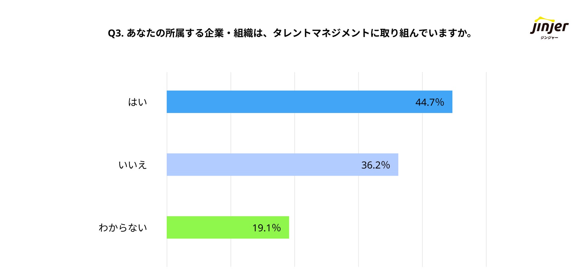 「タレントマネジメントに取り組んでいるか」について質問したところ、44.7%の企業がタレントマネジメントに取り組んでいることがわかりました。一方で、36.2%の企業は取り組んでいないこともわかりました。
