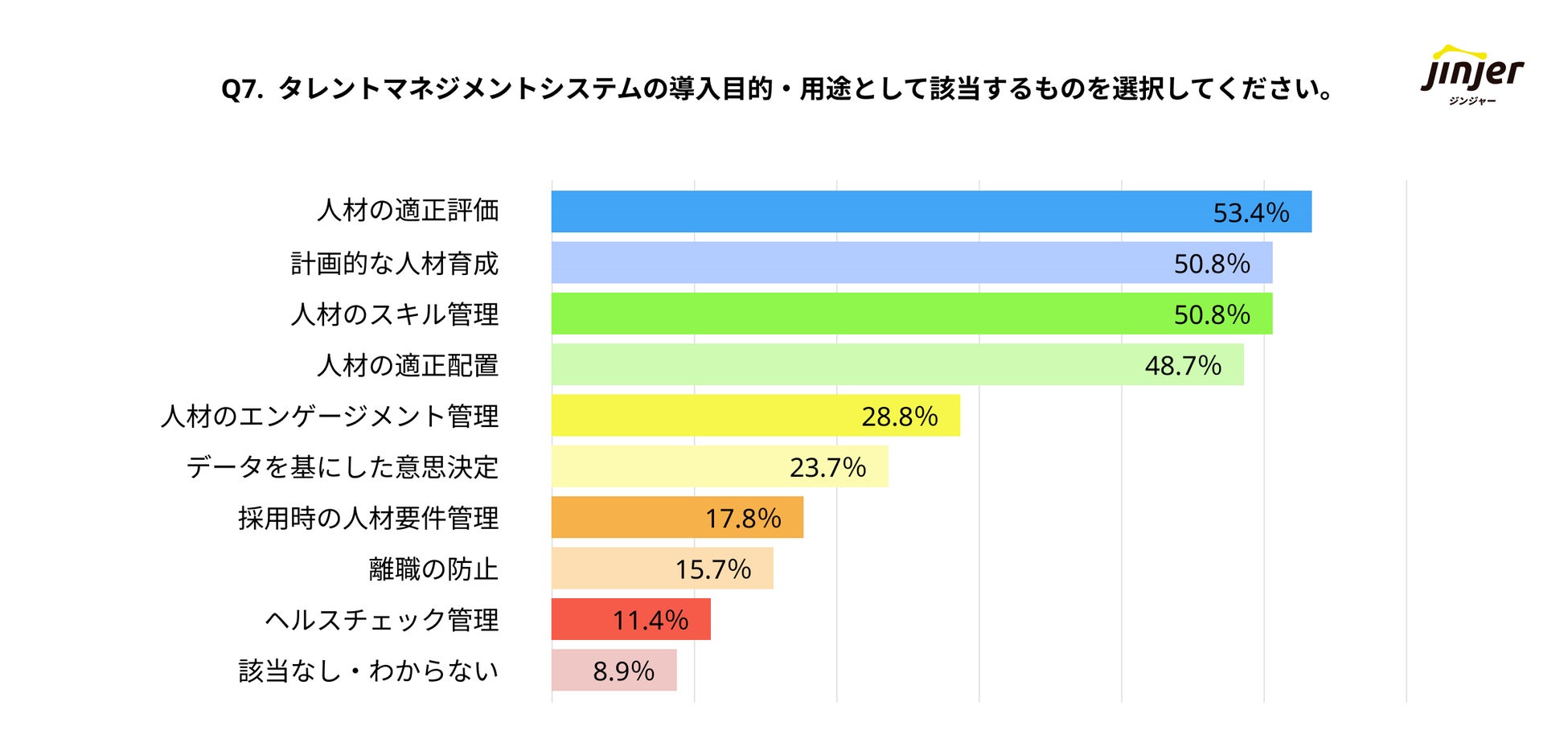 タレントマネジメントシステムの導入目的・用途(複数回答)で、最も多くあった回答は「人材の適正評価(53.4%)」でした。次いで、「計画的な人材育成」「人材のスキル管理」が同率の50.8%、「人材の適正配置(48.7%)」という結果でした。