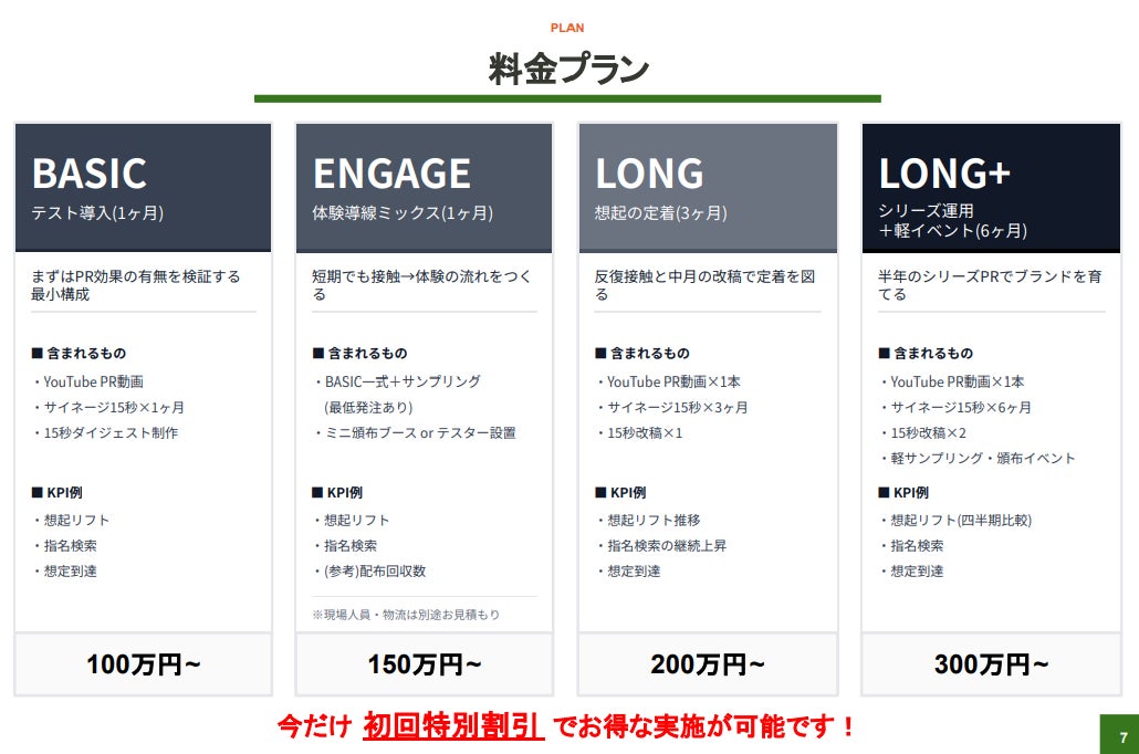 企業のニーズに合わせ、1ヶ月のテスト導入プランから6ヶ月間の本格的なブランディングプランまで、4つの基本パッケージをご用意しています。また、サンプリングやインフルエンサーイベントといった体験型のオプション施策も組み合わせることが可能です。