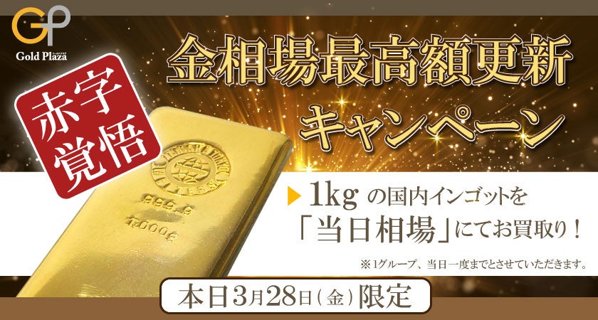ゴールドプラザでは今回の16,000円突破を記念し、3月28日(金)限定企画としてインゴット1kgを当日相場でのお買取キャンペーンを設けさせて頂きました。1日限定の大変お得な内容となっております。これを機にインゴットのご売却をご検討されている方には是非、全国のゴールドプラザへご相談くださいませ。