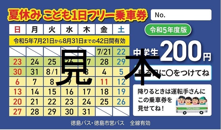 夏休み期間中の小学生及び中学生を対象に、「徳島県内」路線バスの1日フリー乗車券を発行します!