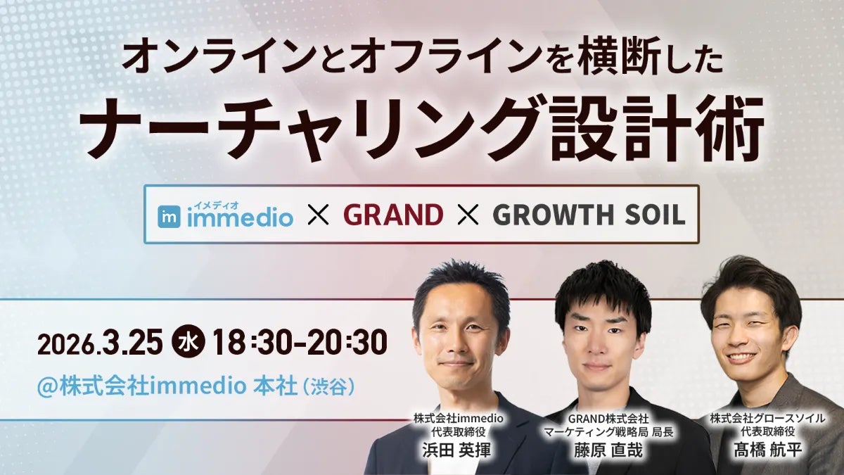 株式会社immedio(本社:東京都渋谷区、代表取締役:浜田 英揮)は、2026年3月25日(水)、GRAND株式会社、株式会社グロースソイルと共に、オンラインとオフラインの垣根を越えた次世代のマーケティング戦略をテーマにした共同イベントを開催いたします。