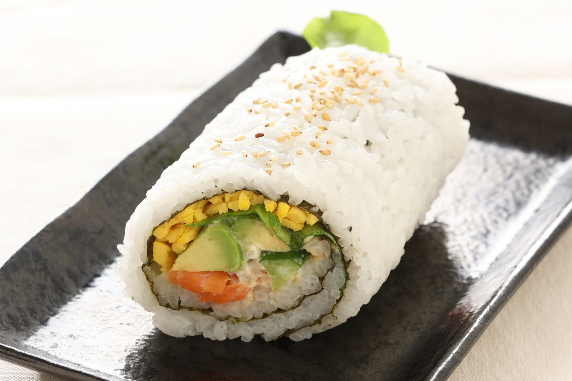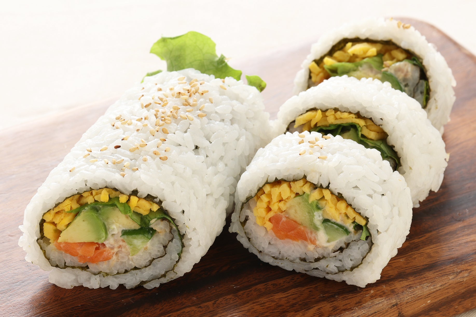 「恵方サラダ巻(サーモン&アボカド)」は、カリフォルニアロールをイメージし、彩り豊かな具材を使用した華やかな巻き寿司です。スモークサーモンとアボカド、グリーンリーフ、きゅうり、錦糸卵、ツナサラダを巻いて仕上げました。