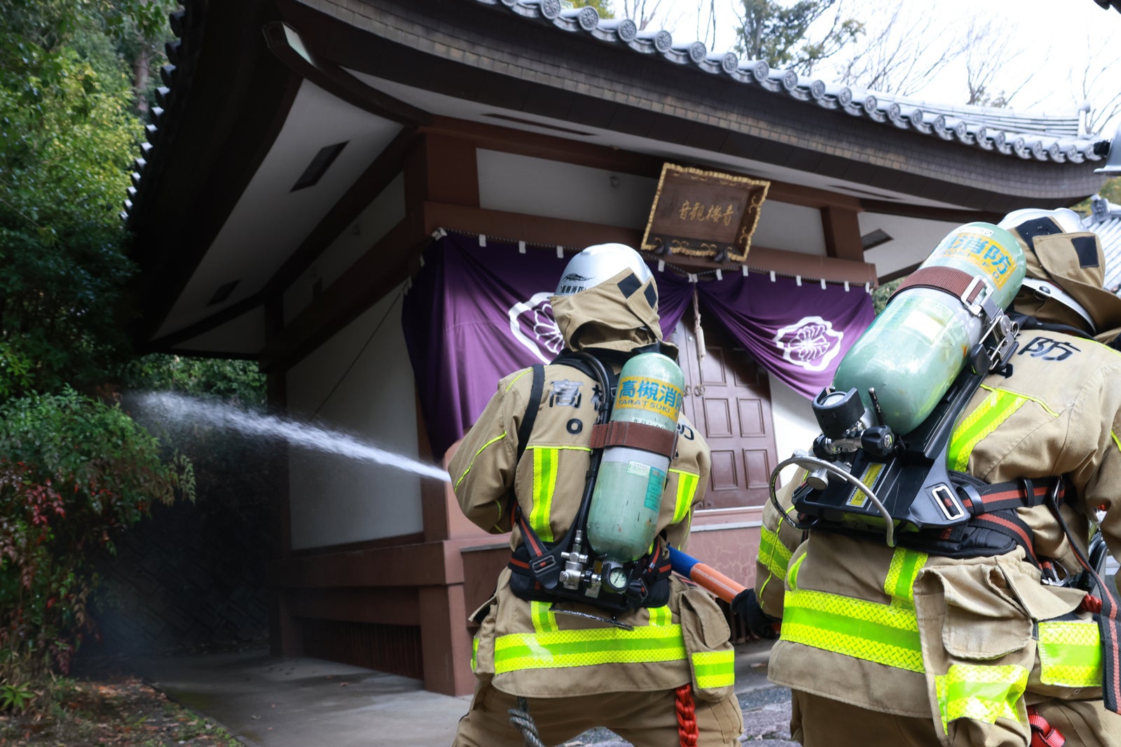 文化財防火デーは、昭和24年1月26日に現存する世界最古の木造建造物である法隆寺(奈良県生駒郡斑鳩町)の金堂が炎上し、壁画が焼損したことを受けて昭和30年に制定。1年のうちでもっとも火災の起こりやすい1、2月に文化財を火災、震災などの災害から守り、文化財愛護に関心を持ってもらうことを目的としています。高槻市でも、毎年、文化財防火デーにあわせて、寺社関係者と消防本部が協力して文化財防火訓練を実施しており、今年は市内6カ所の寺社で実施します。