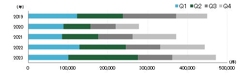 成約面積はリーシング活動の活発度を表す指標である。直近2023年第4四半期は前年同期とほぼ同水準となったものの、2023年の年間の成約面積は約47万坪と2022年を上回った。成約面積は対前年比で3年連続のプラスを記録し、コロナ禍前の2019年の水準を回復した。リーシング活動は拡大傾向が継続している。