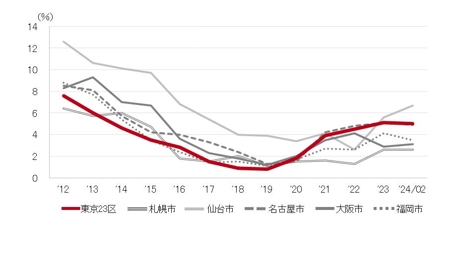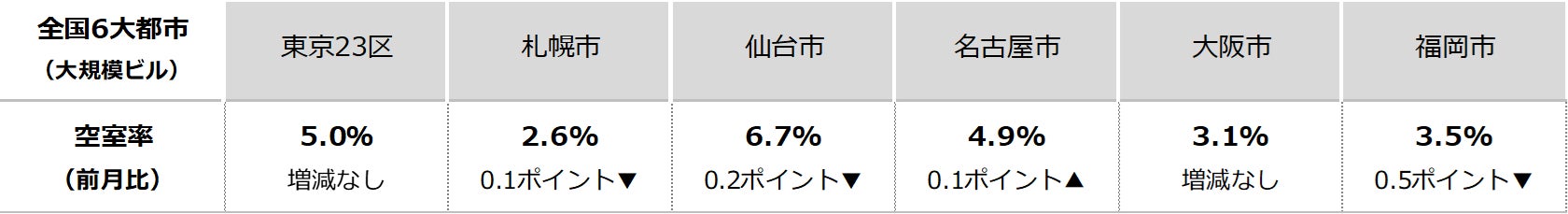 三幸エステート株式会社(本社:東京都中央区、取締役社長:武井重夫)は、2024年2月度の東京都心5区(千代田区、中央区、港区、新宿区、渋谷区)および全国6大都市(東京、札幌、仙台、名古屋、大阪、福岡)の大規模ビル※1のマーケットデータをまとめた「オフィスマーケット2024年3月号」を公表します。