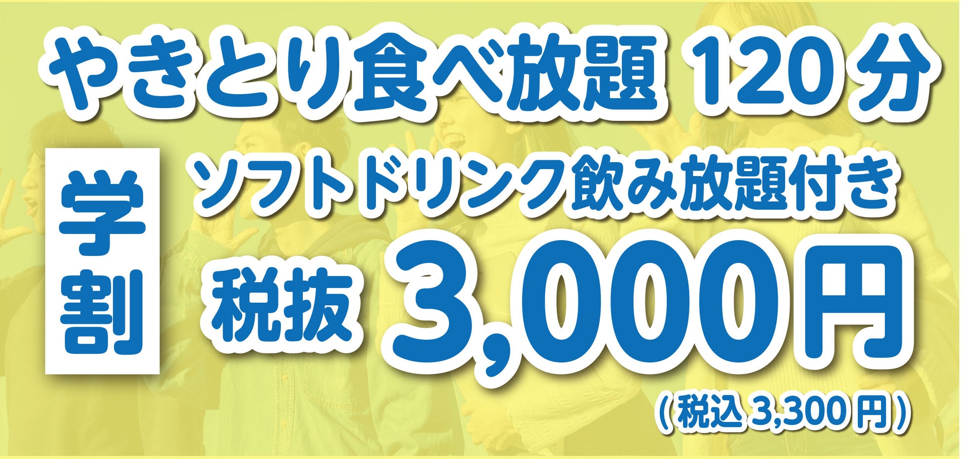 本キャンペーンでは、焼きとり、串揚げ、一品料理、ご飯もの、デザートまで 全35種類以上の人気メニュー を楽しめる食べ放題を、通常価格 税抜3,000円(税込3,300円) にてご提供。さらに、学生グループには嬉しい学割特典として、嬉しいソフトドリンク飲み放題付きです!