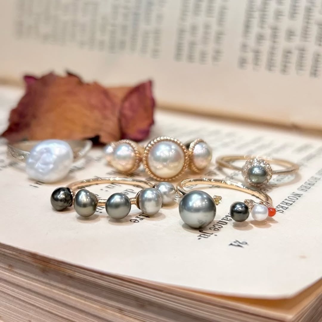定番とは異なる表情のパールジュエリーを通して、素材の奥行きやデザインの違いをご覧いただけるラインアップです。またリングだけではなく、ペンダント、ネックレス、ピアスもご用意しております。