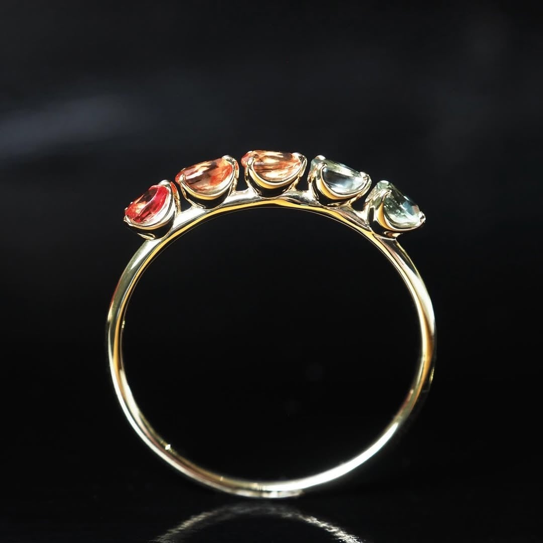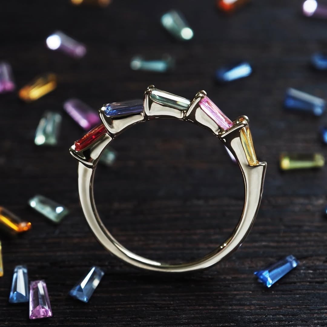 ラウンド、オーバル、ペアシェイプなど、それぞれが持つ輝きや色のニュアンスを、あえて揃えすぎずに組み合わせたデザインです。ダイヤモンドが持つ色幅に、ルビーやサファイアの発色を重ねながら、一石ずつ表情を見極めて配色しています。