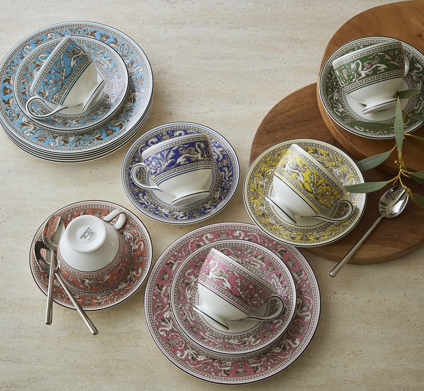 ウェッジウッドでは人気柄「フロレンティーン」の150周年を祝った新色が登場。フロレンティーン全6⾊は、組み合わせも楽しく、ご⾃⾝の個性とスタイルを⾃由に表現できるラインナップです。贈る方のお好みに合わせ、母の日や父の日のプレゼントや、ご結婚されるお二人への贈り物としても最適です。全国百貨店のウェッジウッドショップでは、オリジナルの風呂敷をプレゼントする「フロレンティーン150周年キャンペーン」を実施しています。