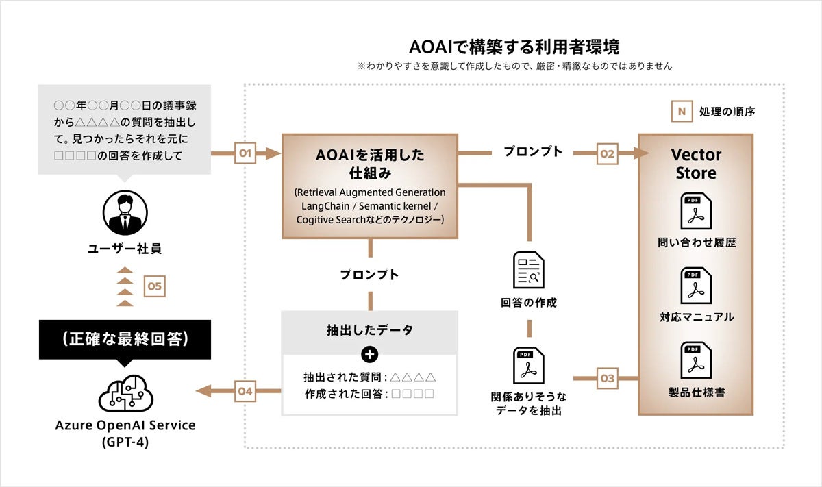 Azure OpenAI Serviceを活用した仕組みの開発が可能で、社内のデータを学習させ、GPTの既知のデータと組み合わせて、回答を導き出すことができます。