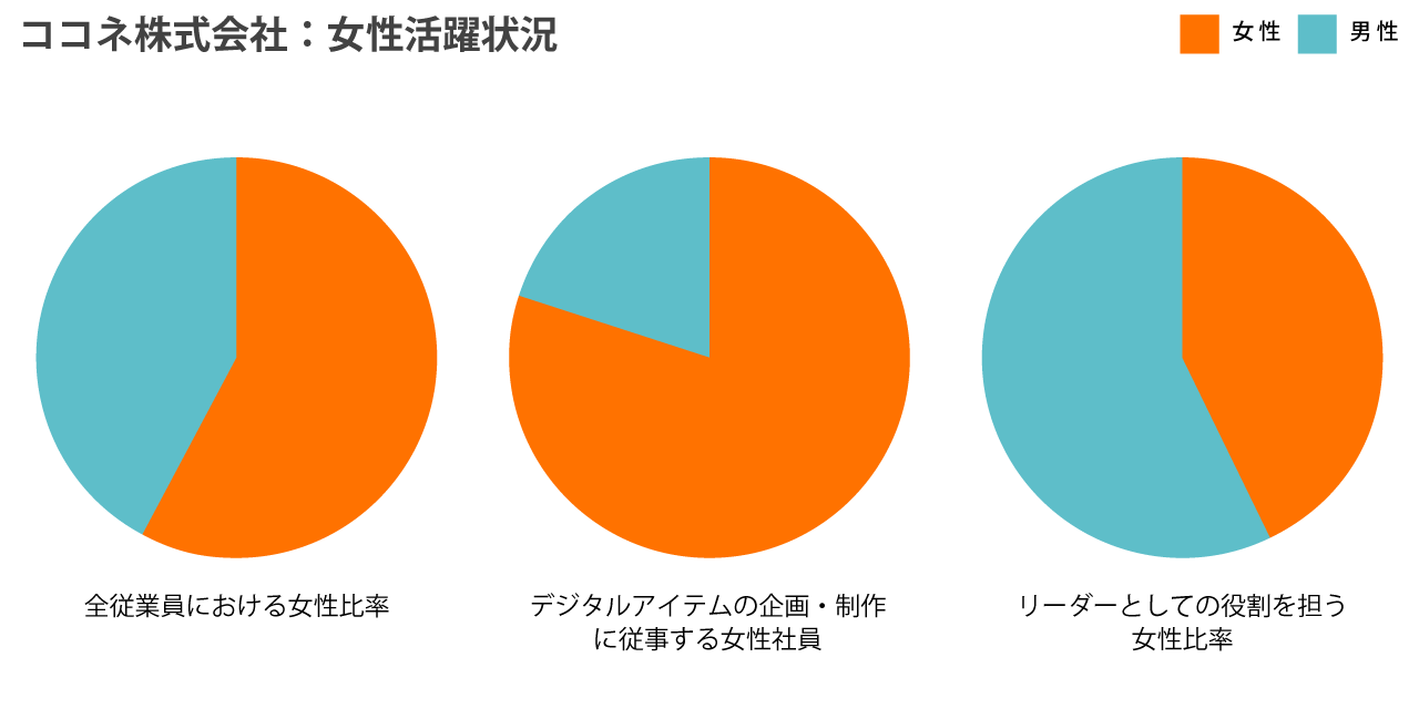 また、リーダーとしての役割を担うメンバーの半数近くを女性社員が務めていることもあり、ココネは以前から女性が活躍しやすい環境を作ってまいりました。