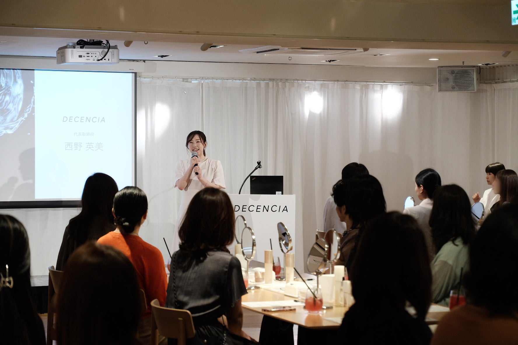 イベントの冒頭では、2025年1月に代表取締役に就任した西野が、感謝の気持ちと「肌の不公平をなくしたい」というディセンシアの企業パーパスを語り、参加者と共にイベントを盛り上げる熱いメッセージを発信しました。