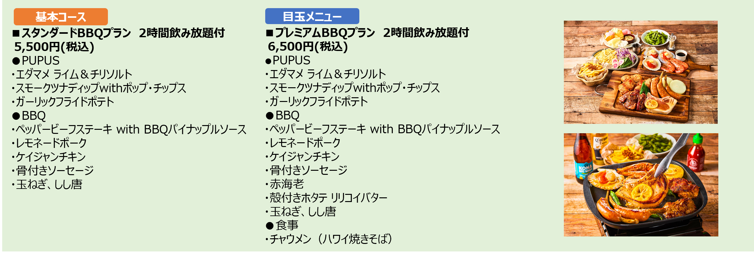 今年は、海鮮も楽しめるサーフ&ターフに〆のハワイアン焼きそば”チャウメン”も付く「プレミアムプラン」と、リーズナブルな「スタンダードプラン」の2種類をご用意。駅直結で気軽に開放的なハワイアンビアガーデンを楽しめます。