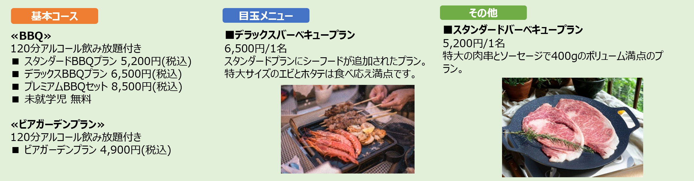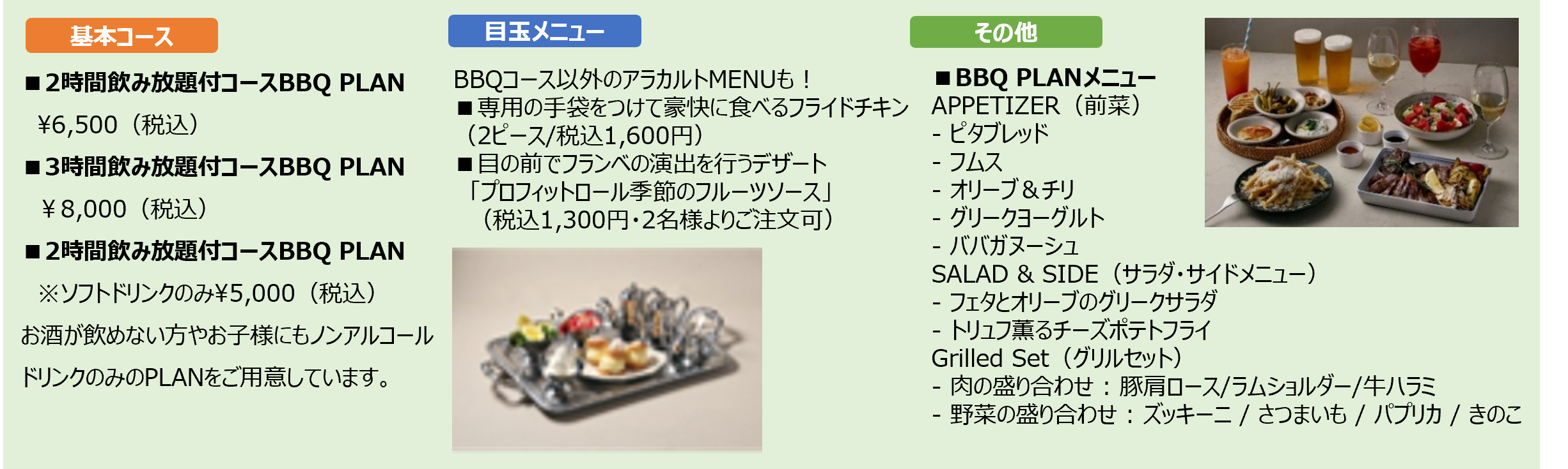 開放的なテラス席では、友人や家族、恋人など、さまざまなシーンで利用可能。シンプルに楽しめるBBQコースから、華やかな演出を取り入れた体験型コース、さらに限定スイーツ付きプランまで、多彩なラインナップを取り揃えています。また、食材持ち込みでの席のみ予約にも対応し、自由度の高い楽しみ方ができる点も魅力です。