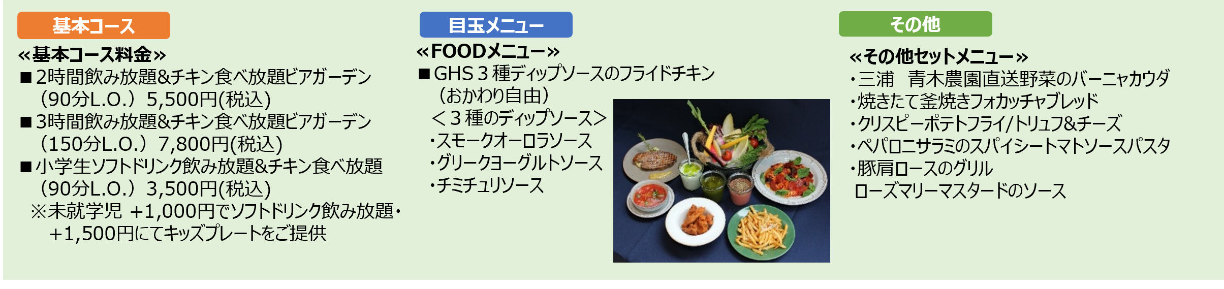 ガーデンハウスは、広々とした店内と開放感のあるテラスを備えたオールデイダイニングです。10周年を迎えた今年お届けするビアガーデンは、昨年好評いただいた食べ放題をさらにバージョンアップ。ビールにぴったりのフライドチキンを選べるディップで、飽きることなく食べ放題でお召し上がりいただけます。また、三浦産の野菜を使ったバーニャカウダで、野菜もたっぷりとお召し上がりいただけます。