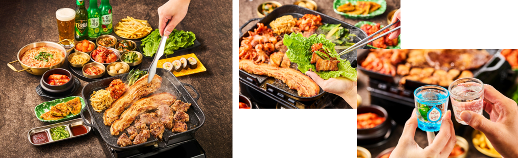 店名の通り「韓国酒場」をイメージしたビアガーデンが登場。韓国の屋台文化「ポチャ」を思わせるメニューや内装を取り入れ、モダンとレトロが融合した新しい韓国酒場の空間を演出します。全コースでは韓国総菜の「パンチャン」や「キムチバー」を食べ放題でご用意。BBQメニューのほか、豊富なおつまみメニューも取り揃え、食事としてはもちろん、お酒を気軽に楽しむ酒場としても楽しめます。