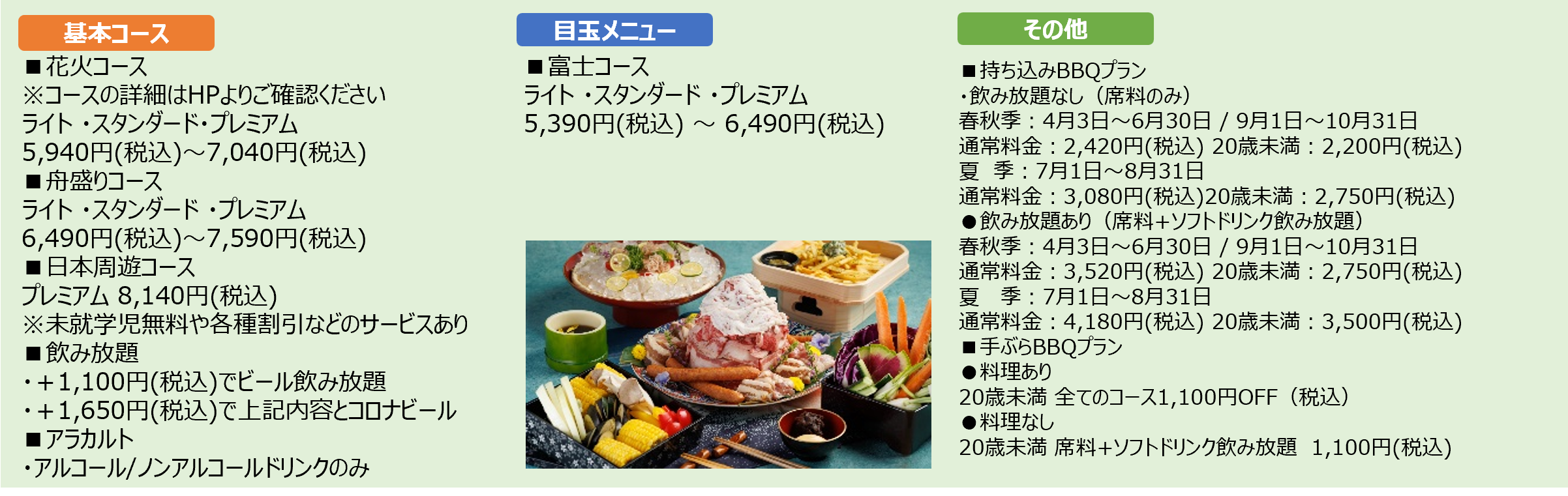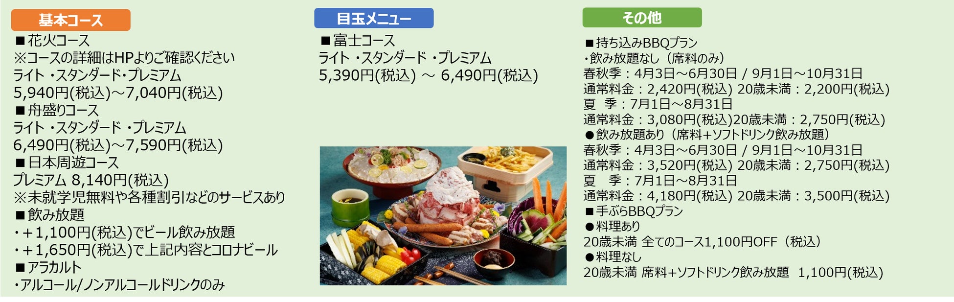 ・目玉コースの“富士コース”や“日本周遊コース”など華やかな食事も楽しめるプランも豊富に展開