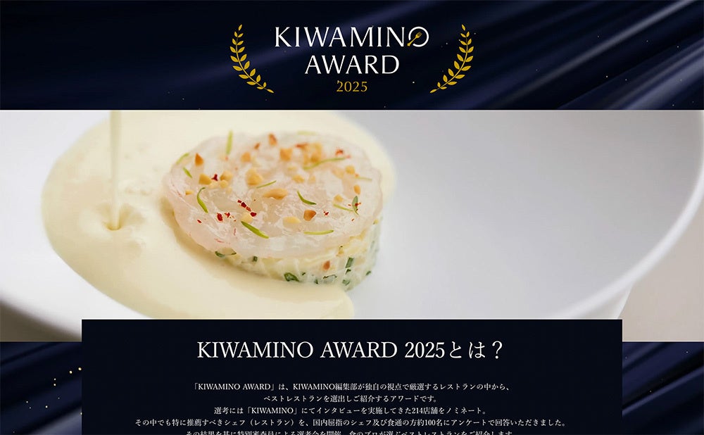 「KIWAMINO AWARD 2025」は、KIWAMINO編集部が独自の視点で厳選するレストランの中から、ベストレストランを選出しご紹介するアワードです。選考には「KIWAMINO」にてインタビューを実施してきた214店舗をノミネート。その中でも特に推薦すべきシェフ(レストラン)を、国内屈指のシェフおよび食通の方約100名にアンケートで回答していただきました。その結果を元に審査員による選考会を開催。食のプロが選ぶベストレストランをご紹介します。