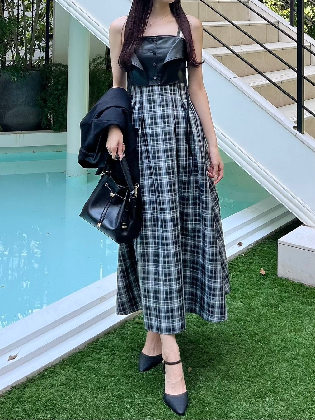 フェイクレザーのビスチェ×ウエストタックのチェックスカートのレイヤードに心ときめく仕上がり。リアルなレイヤード感をお楽しみいただけるようドッキング部分の重ね方にこだわっており、MERCURYDUOらしいウエストの"美シルエット"が最大のポイントです。